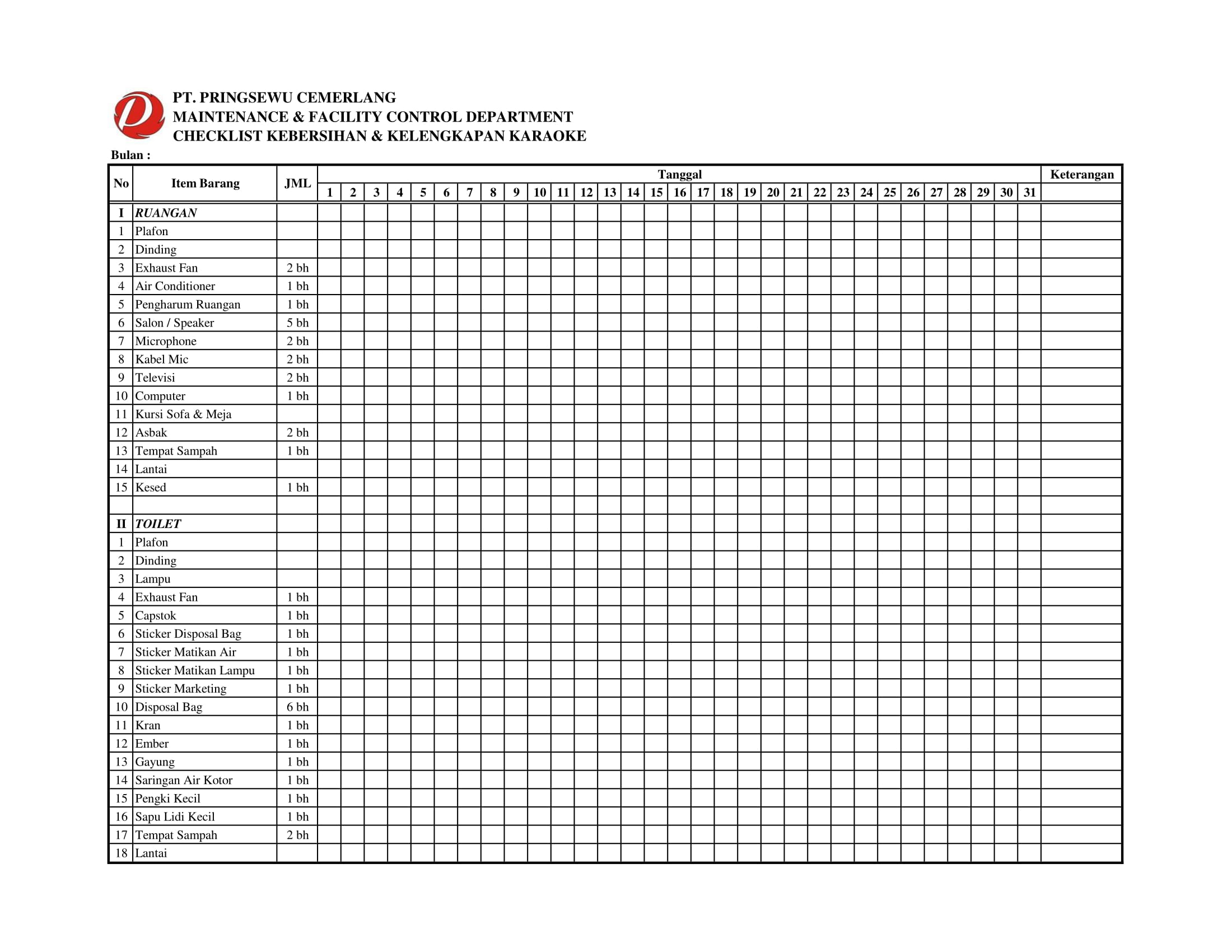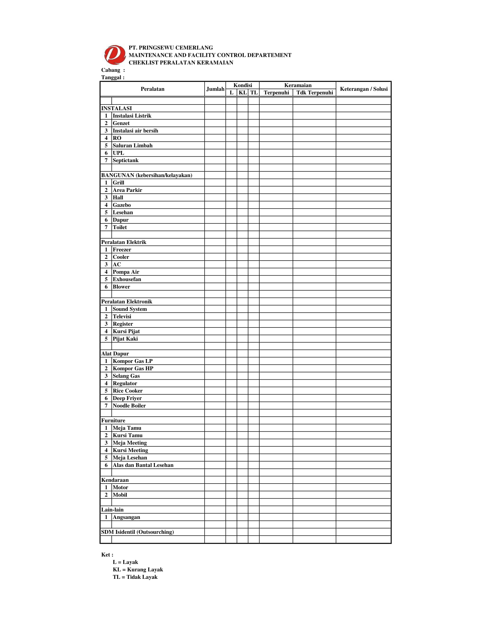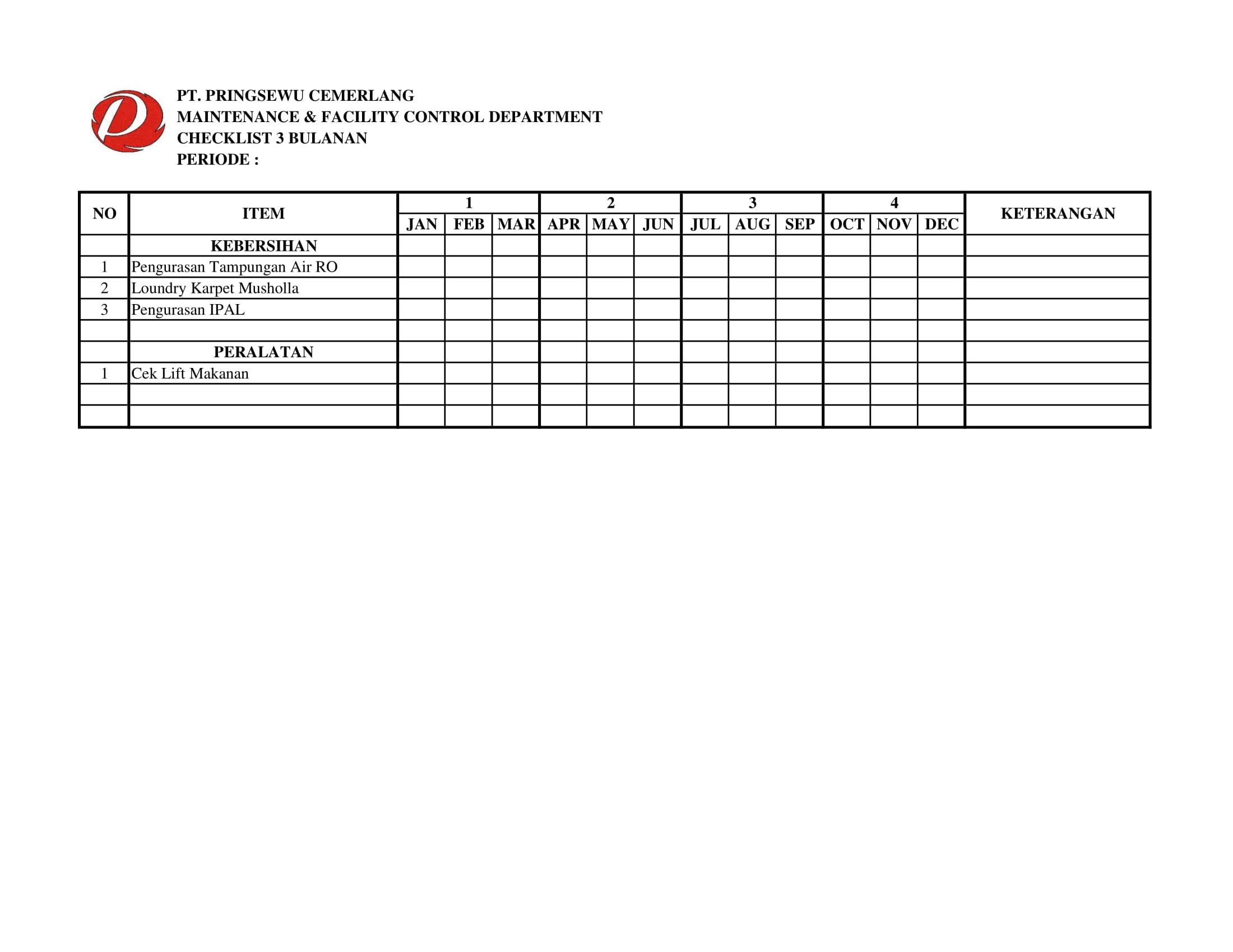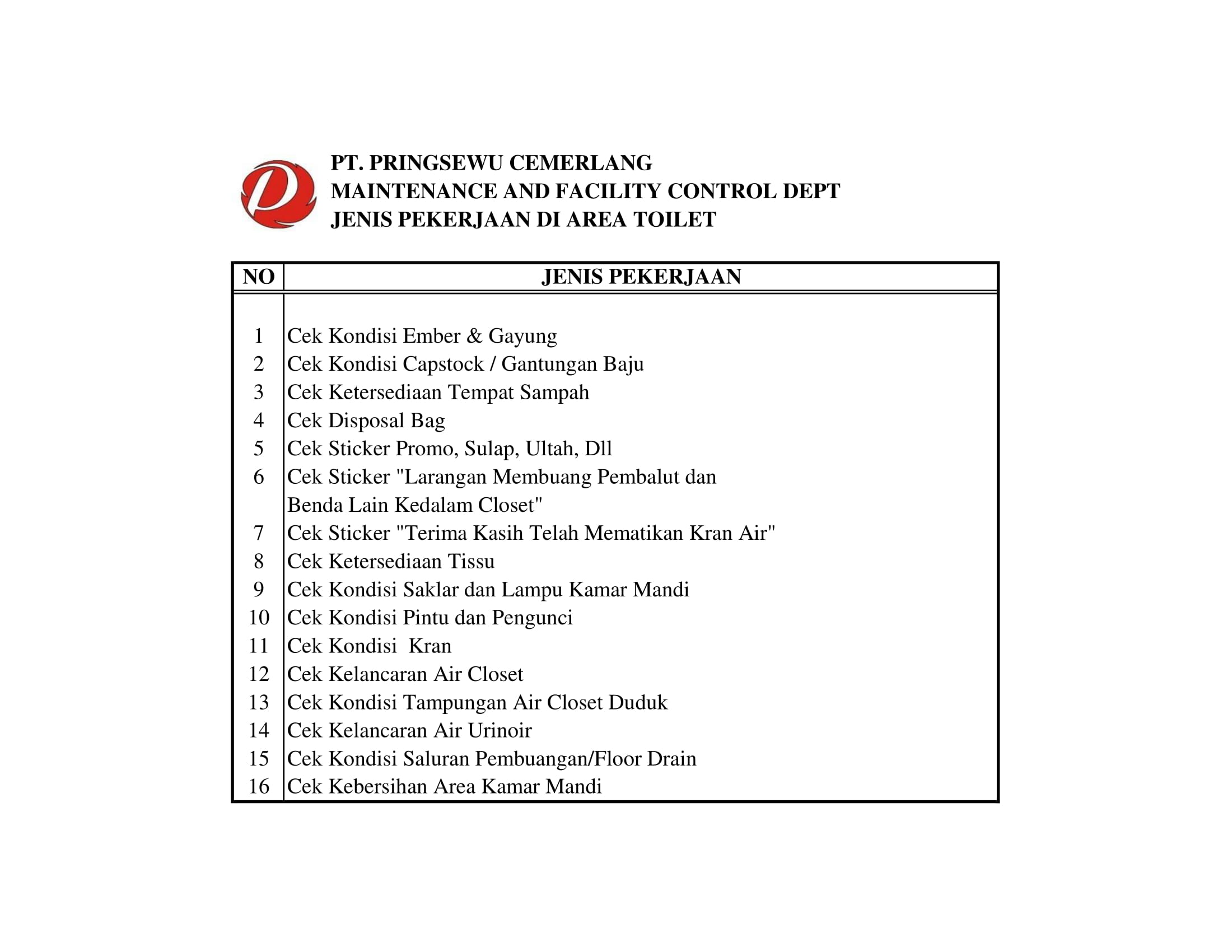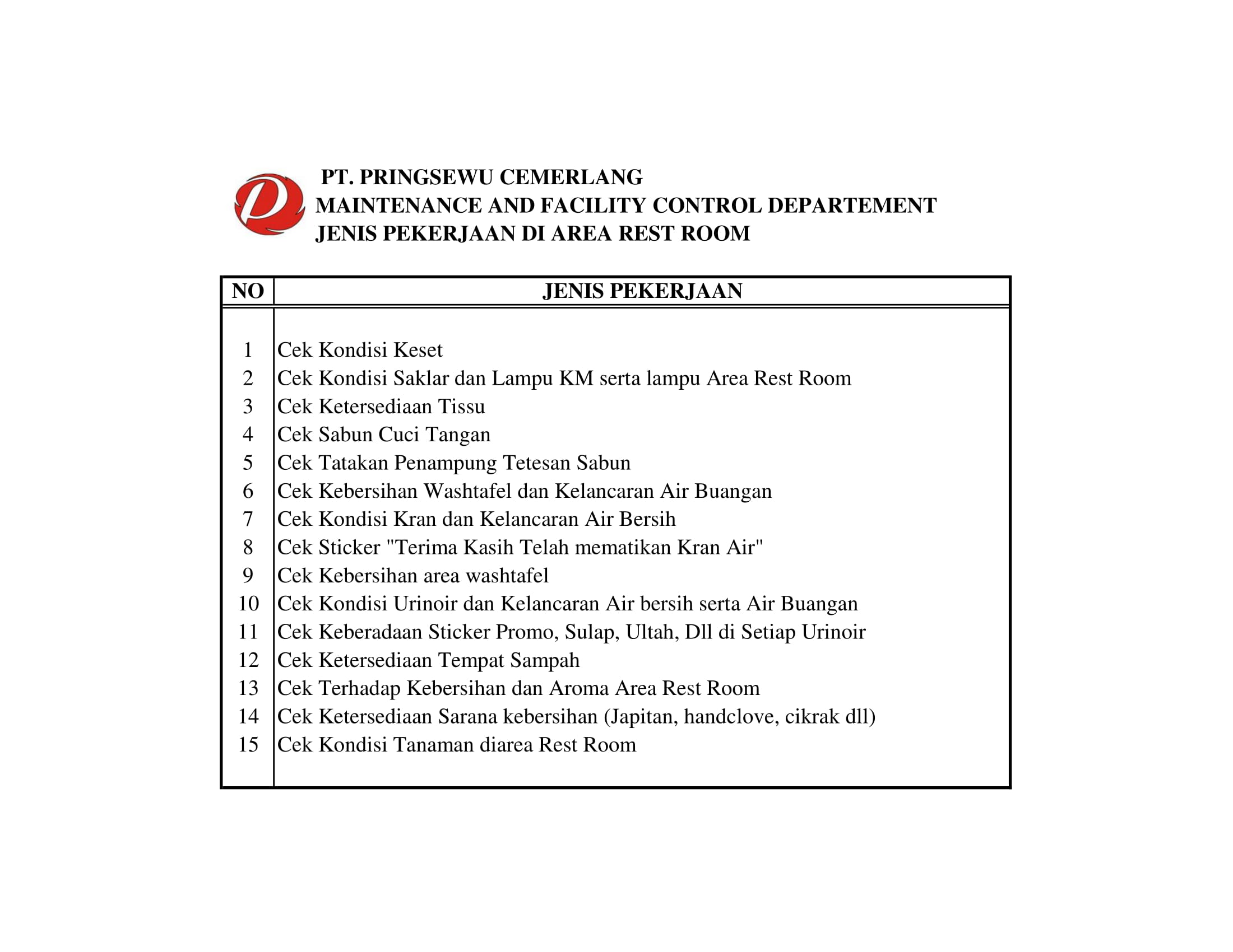 Berikut Checklist Departemen Maintenance and Facility Control di Pringsewu Restaurant Group.