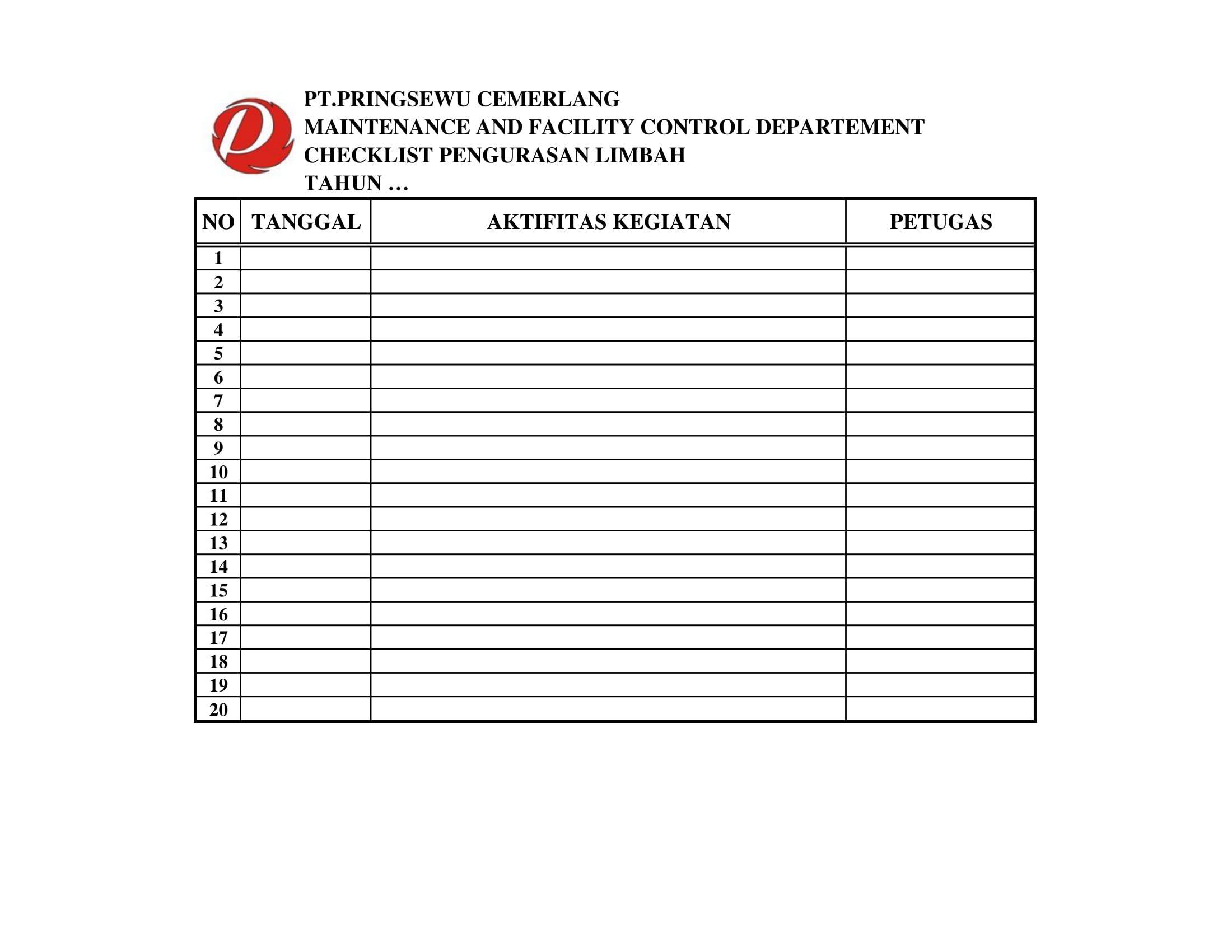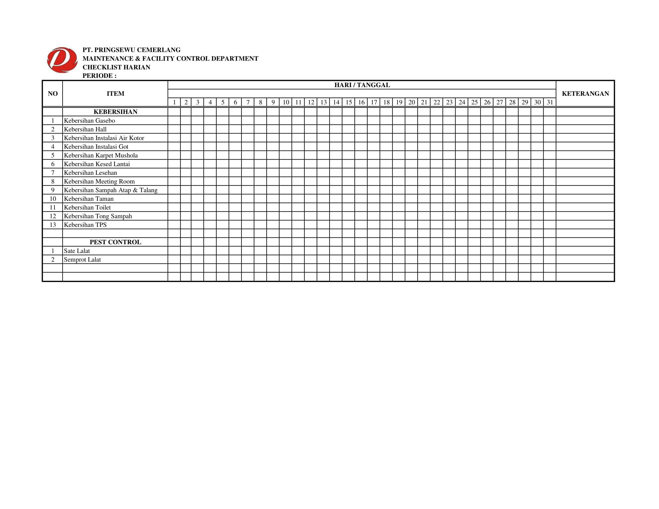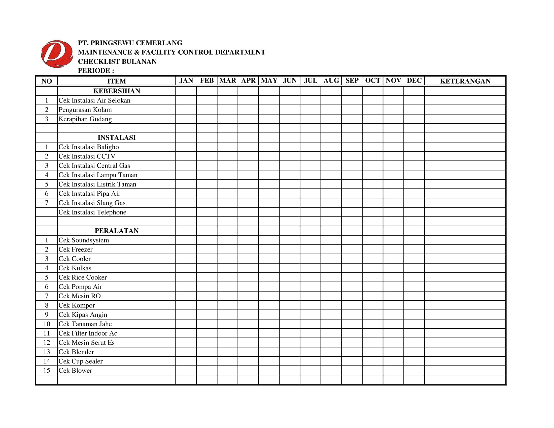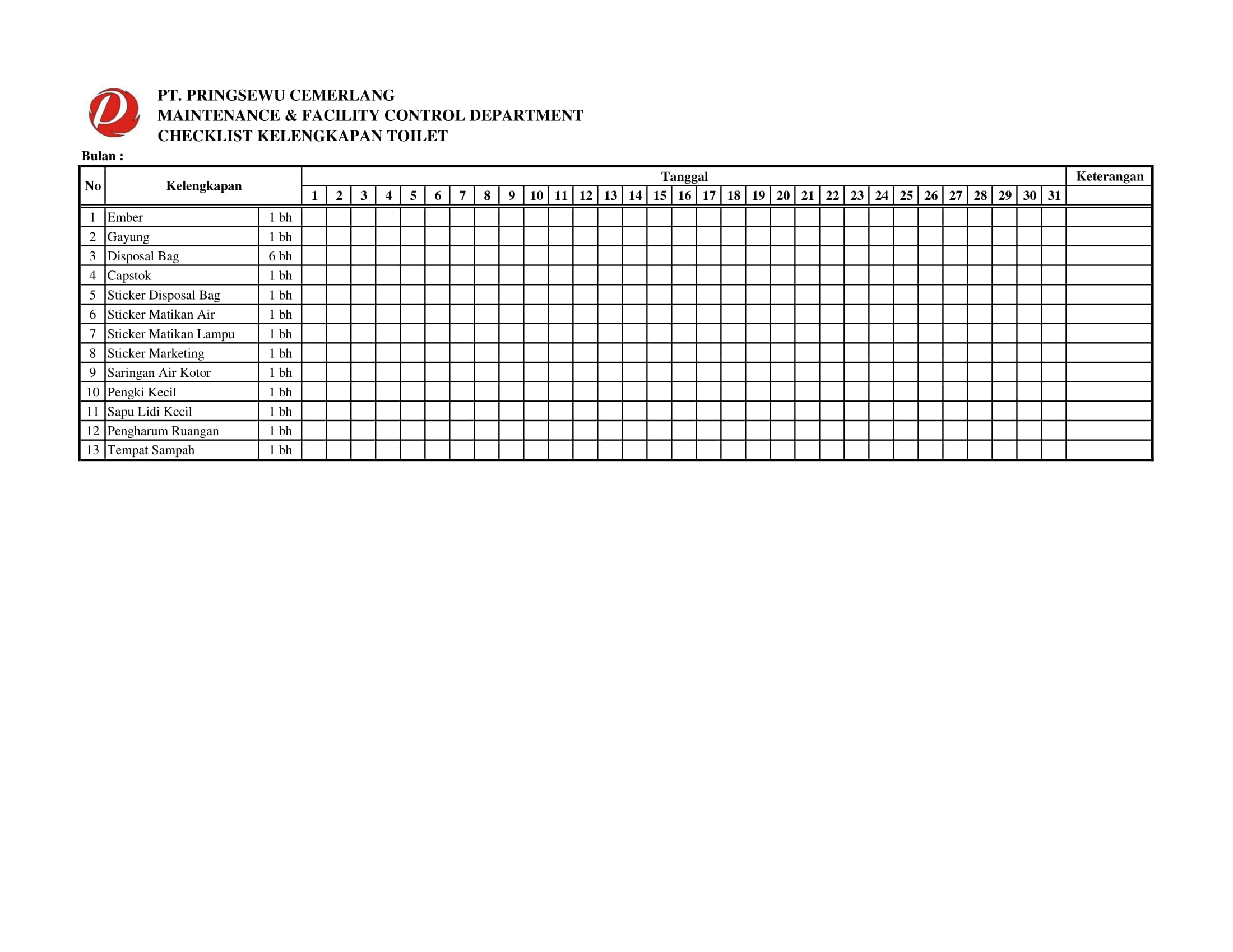 Berikut Checklist Departemen Maintenance and Facility Control di Pringsewu Restaurant Group.