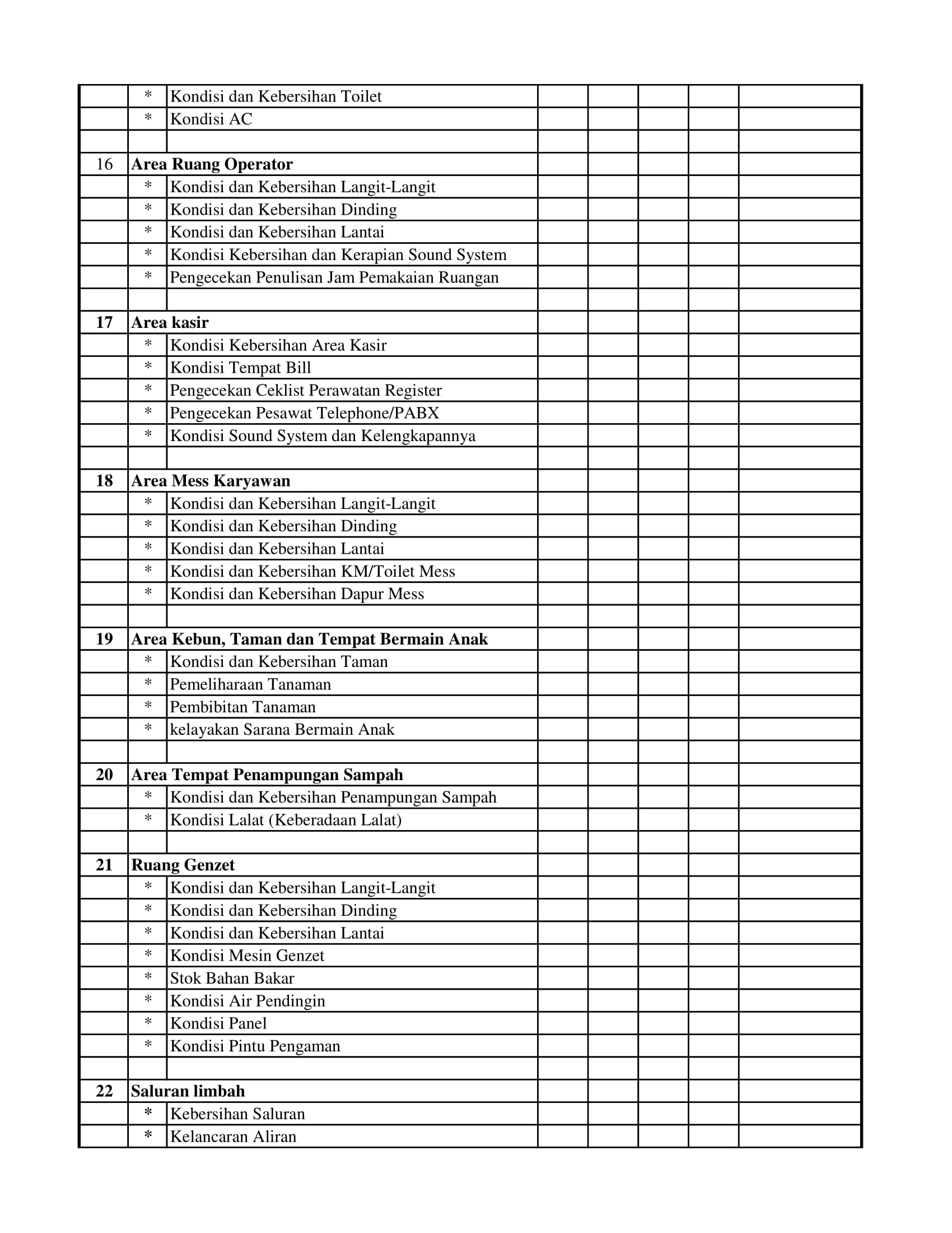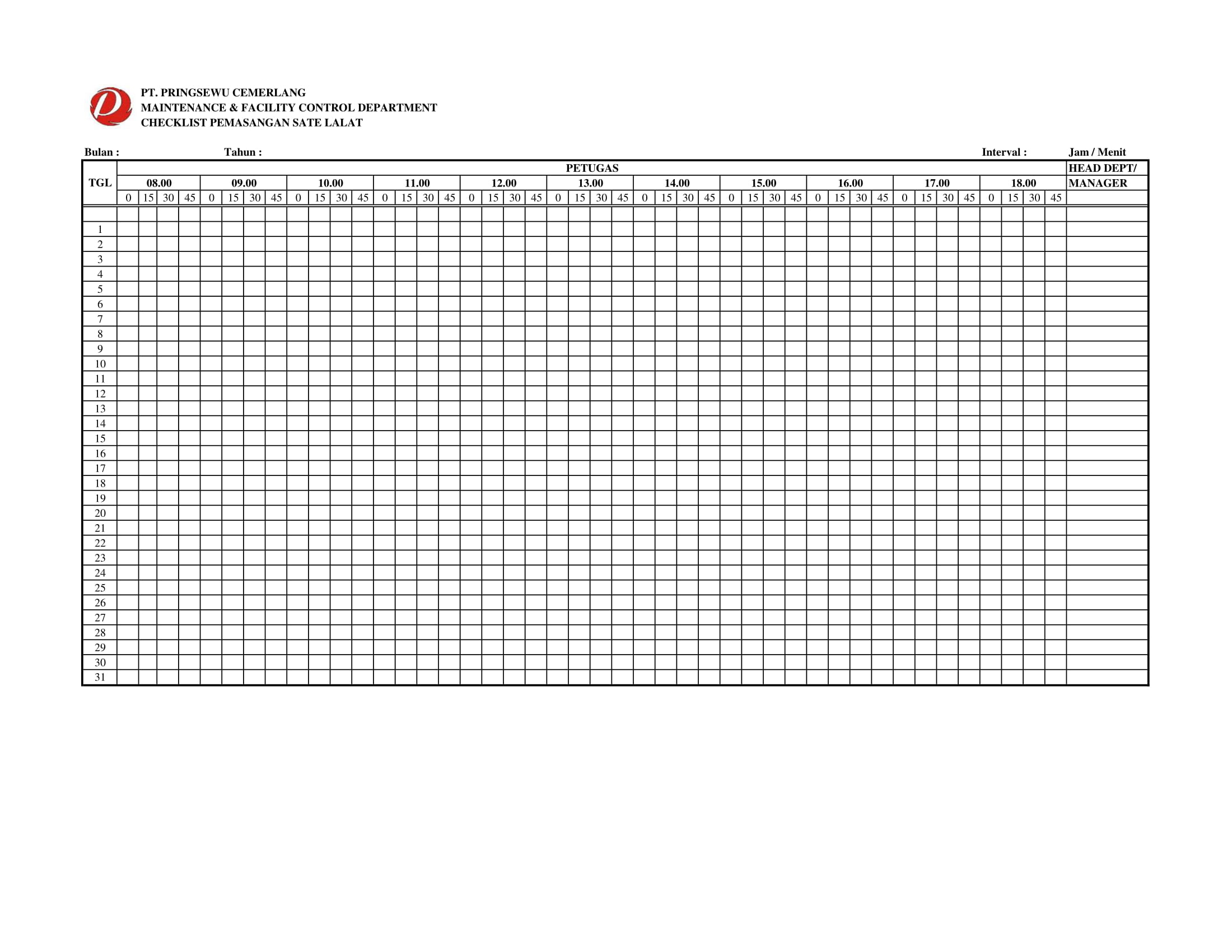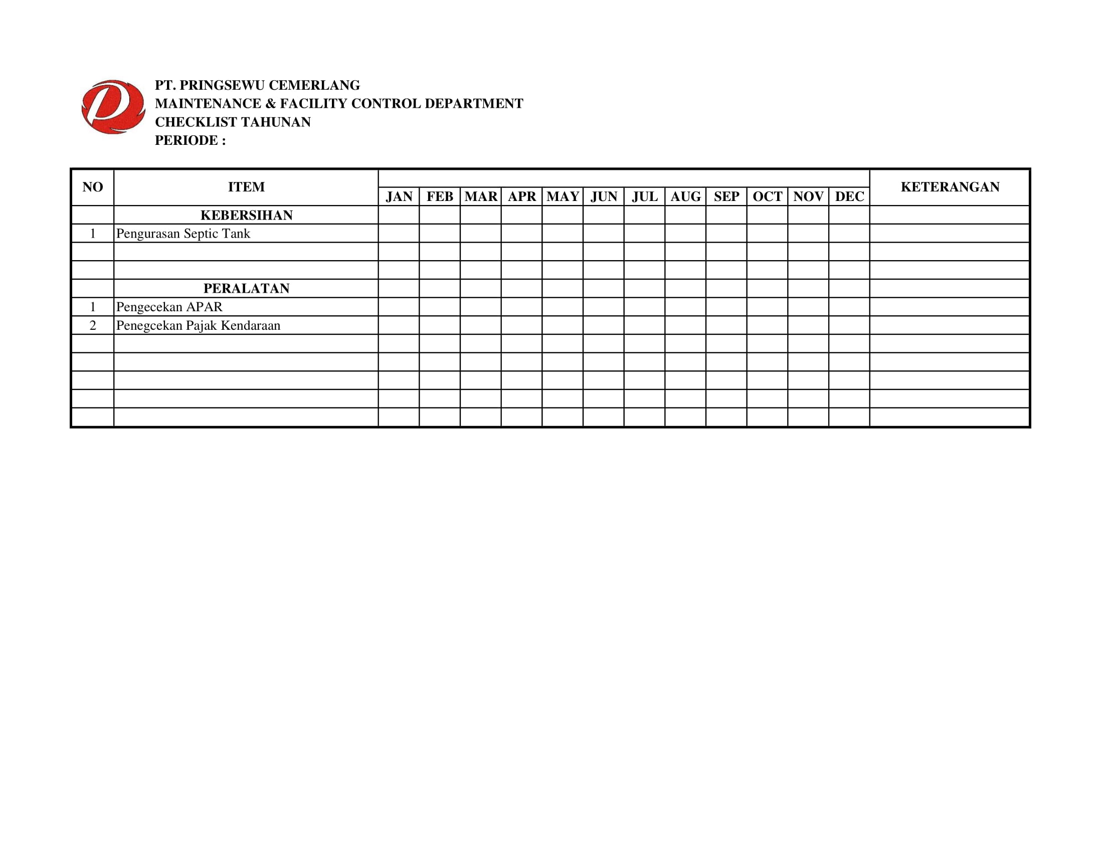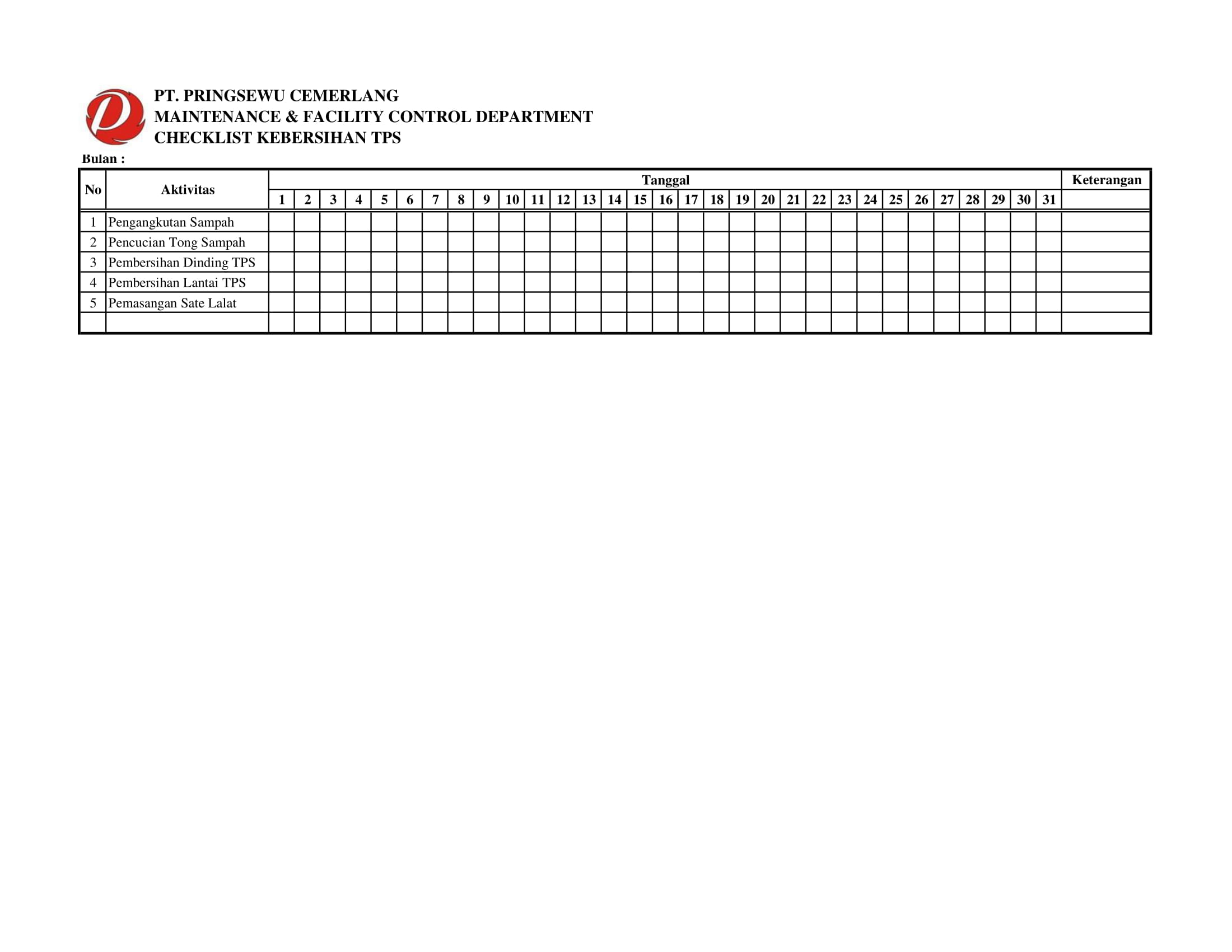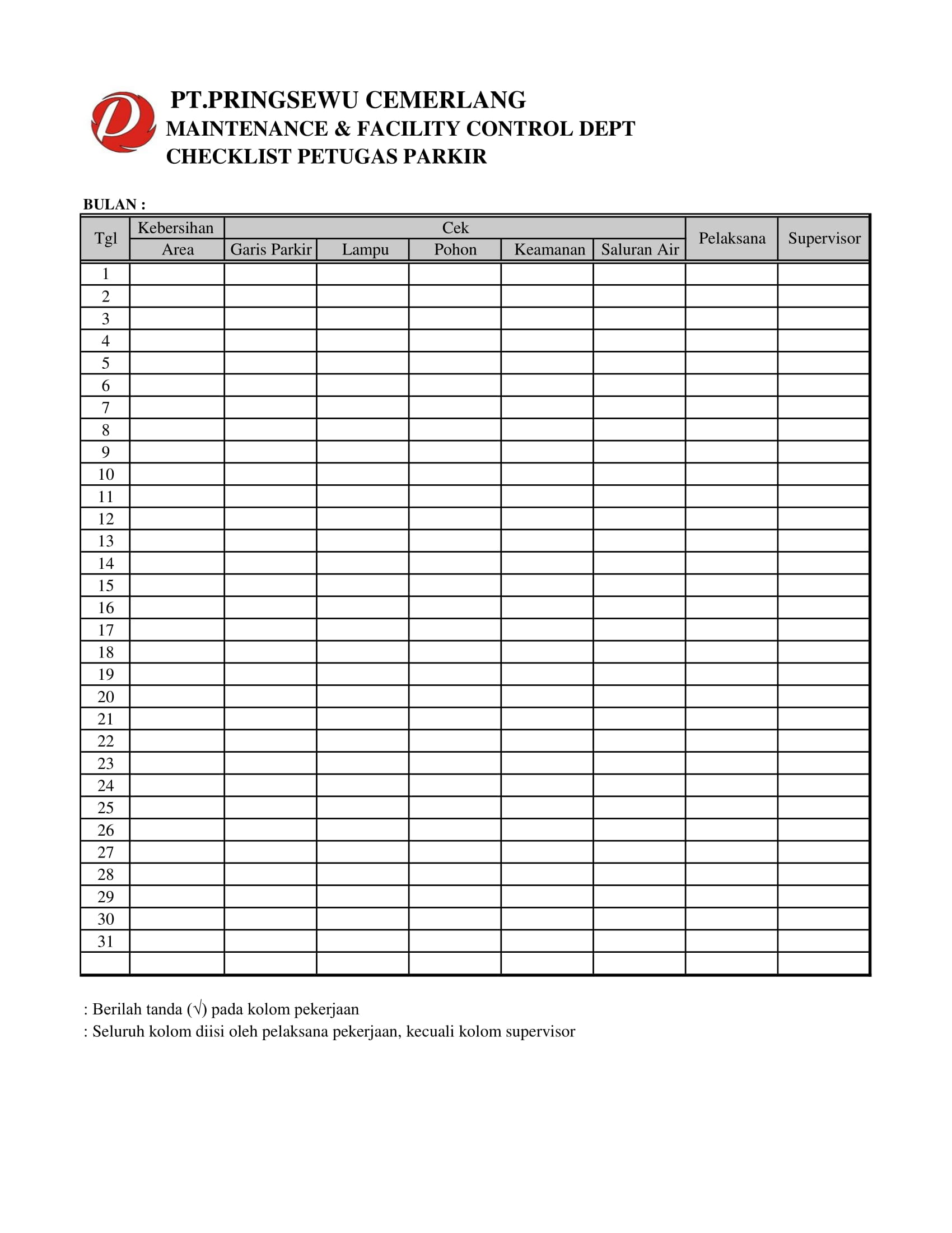 Berikut Checklist Departemen Maintenance and Facility Control di Pringsewu Restaurant Group.